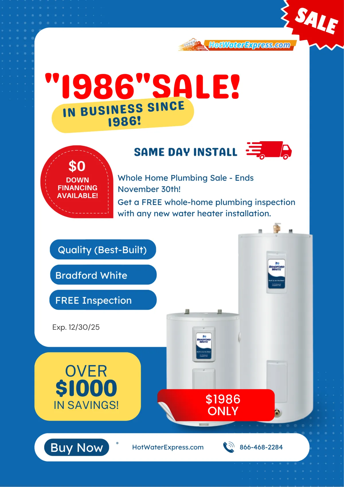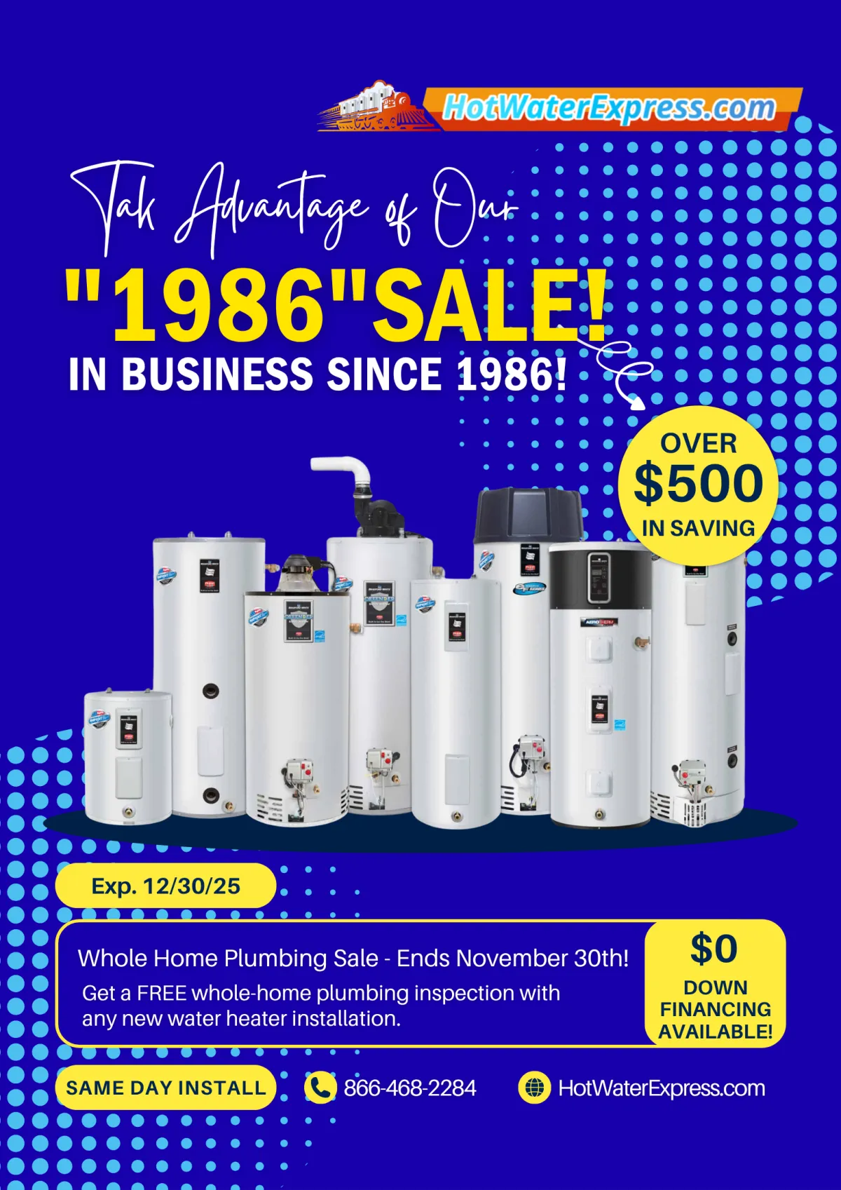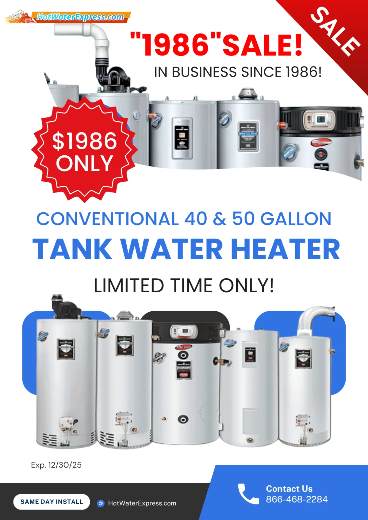 Hot Water Express provides affordable water heater solutions with easy financing options and local, certified technicians. Need hot water back today? Call now or use our convenient online form and see why Hot Water Express has been the DMV's go-to for reliable service since 1986. Same-Day Installation Guarantee (if you call by noon)! Be sure to mention our website specials when you call.
